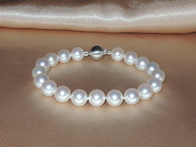 Perlový náramok APB8085C vyrobený z japonských bielych morských akoya perál veľkosti 8 - 8,5 mm a uzáveru zo zlata. Perly najvyššej kvality AAA sú dokonale guľaté a majú nádherný vysoký lesk a hladký povrch. Medzi každou perlou sú naviazané uzlíky kvôli bezpečnosti a krajšiemu vzhľadu, navlečené sú na pevnej hodvábnej niti. Dĺžka perlového náramku je cca 195 mm. Náramok je možné vyrobiť v rôznych dĺžkach s primeraným zvýšením, alebo znížením ceny. Náramok je ukončený krúžkami a uzáverom zo zlata rýdzosti 585/1000 (14kt.). Je možné si vybrať farbu zlata. Perlový náramok dostanete s certifikátom pravosti v darčekovej krabičke a v rámci Česka a Slovenska máte dopravu zdarma.