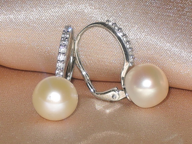 Perlové náušnice vyrobené z pravých broskyňovoružových sladkovodných perál a kovaní z bieleho zlata rýdzosti 585/1000 (14kt.). Perly s povrchovou kvalitou AAA majú pologuľatý tvar, hladký povrch a veľmi vysoký lesk. Kovania náušníc pozostávajú z patentov kombinovaných so zirkónmi. Každá náušnica má 7 ks zirkónov veľkosti 1,5 mm. Hmotnosť páru kovaní je cca 2,15 gramu. Veľkosť perál je 9 mm. Na fotografii sú perly veľkosti 9 mm. Výška patentu je cca 18 mm - vhodnejší pre vyššie prepichnuté dierky. Na požiadanie k náušniciam doporučíme prívesok a prsteň ako kombináciu do setu šperkov. Náušnice posielame v darčekovej krabičke s certifikátom pravosti.