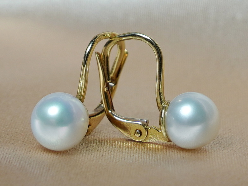 Zlaté perlové náušnice DS701YFE-W vyrobené z pravých bielych sladkovodných perál a uzatváracieho patentu zo žltého zlata rýdzosti 585/1000 (14kt.). Riečne perly kvality AAA majú okrúhly tvar, hladký povrch a veľmi vysoký lesk. Hmotnosť páru kovaní je cca 1,3 gramu. Perly môžete voliť od veľkosti 7,0 mm do 8,5 mm. Na obrázku sú perly veľkosti 8 mm. Šperky posielame v darčekovom balení spolu s certifikátom pravosti.