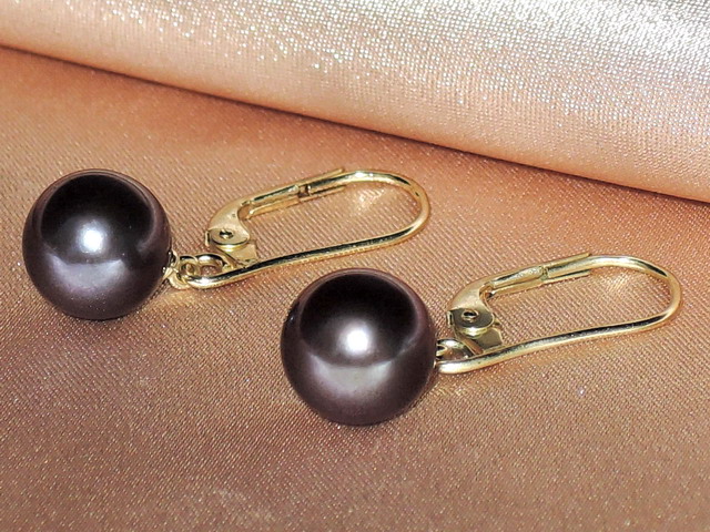 Výnimočné elegantné náušnice z čiernych sladkovodných perál kvality AAA. Použité sú kovania zo žltého zlata rýdzosti 585/1000 (14kt.) hmotnosti cca 1,6 gramu s uzatváracími patentami. Je možné si vybrať perly veľkosti 8-10 mm. Tento šperk je vhodný k prívesku RPP002bM, s ktorým tvorí nádherný set. Na fotografii sú perly veľkosti 9,5 mm. Šperky posielame v darčekovom balení spolu s certifikátom pravosti.
