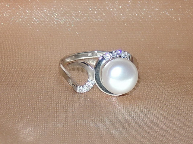 Luxusný prsteň je kombináciou kovania zo striebra, zirkónov a bielej sladkovodnej perly. Čiastočne sploštená perla má veľmi vysoký lesk (AAA) a čistý povrch (AAA). Perla môže mať veľkosť 8 - 8,5 alebo 9 - 9,5 mm. Kovanie prsteňa je zo striebra rýdzosti 925/1000 kombinované so zirkónmi veľkosti 1,5mm. Celková hmotnosť striebra prsteňa je cca 1,8 gramu pre veľkosť prsteňa č.57. Menšia úprava veľkosti prsteňa možná po vzájomnej dohode. Na fotografii je prsteň s veľkosťou perly 9 a 8 mm. Šperky posielame v darčekovom balení.