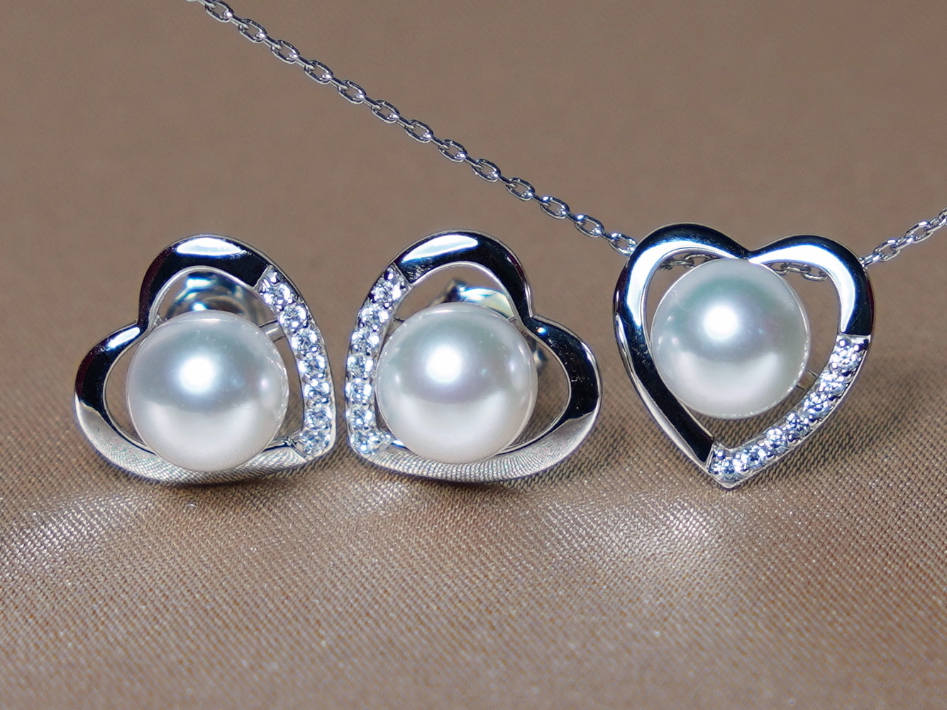 Set šperkov z riečnych perál WW014WS-FW pozostáva zo zlatých náušníc s perlou WW014WE-FW a zlatého prívesku s perlou WW012WP-WF v tvare srdiečok. Set perlových šperkov je vyrobený z pravých sladkovodných perál v najvyššej AAA kvalite a kovaní z bieleho 14 kt. zlata.
