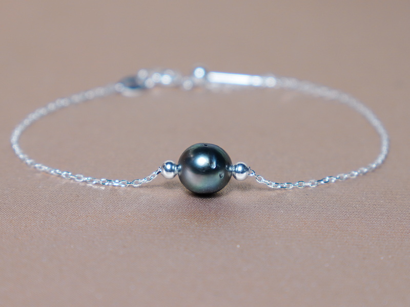 Strieborný náramok s tahitskou perlou T123SU vyrobený z pravej tahitskej perly kvality A+ a striebornej retiazky. Jemná strieborná retiazka rýdzosti 925/1000 s nastaviteľnou dĺžkou do 18 cm má hmotnosť 0,75 gramu. Nastavenie dĺžky retiazky je zabezpečené zarážkou pri uzávere, ktorá je dostatočne pevná na to, aby sa retiazka svojvoľne neposúvala, ale aj dostatočne priechodná, aby ste dĺžku pohodlne nastavili. Poloha perly je zabezpečená dvoma posuvnými striebornými zarážkami so silikónovým vnútrom. Veľkosť perly je cca 8 mm. Perlový náramok posielame v darčekovom balení.