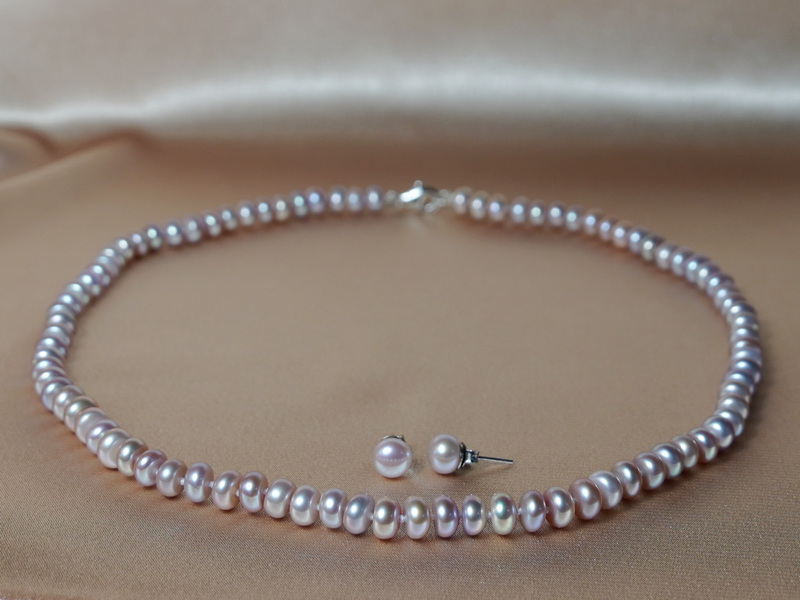 Súprava perlových šperkov BPS6575AA+LG je vyrobená z fialovoružových riečnych perál. Náhrdelník je vyrobený zo sploštených (button) perál veľkosti 6,5 - 7,5 mm s povrchovou kvalitou AA+ a leskom AAA, viazaný na pevnej hodvábnej niti. Medzi každou perlou sú naviazané uzlíky kvôli krajšiemu vzhľadu a bezpečnosti. Perlový náhrdelník je ukončený karabínou zo striebra rýdzosti 925/1000. Môžete vybrať náhrdelník v dĺžke 40 cm alebo 45 cm. Na požiadanie vyrobíme náhrdelník v iných dĺžkach s primeraným zvýšením alebo znížením ceny. Náušnice sú vyrobené z pologuľatých/sploštených perlál veľkosti 7 - 7,5 mm s kovaniami zo striebra rýdzosti 925/1000.