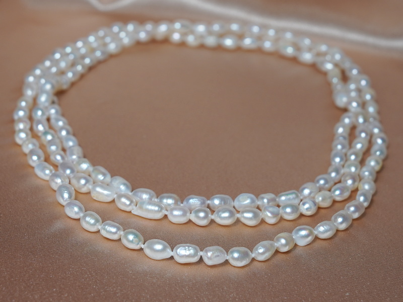 Dlhý perlový náhrdelník DPN6070AwG vyrobený z bielych sladkovodných podlhovastých perál nepravidelného tvaru veľkosti cca 6-7 x 8-9 mm. Perly sú v kvalite A - nepravidelný tvar, dobrý lesk, chyby na povrchu perál (vidieť na fotografiách) svedčia o pravosti perál. Dĺžka náhrdelníka je 157 cm, je možné ho nosiť viacerými spôsobmi a tak ho prispôsobiť rôznym príležitostiam a rôznemu oblečeniu. Perlový náhrdelník je viazaný na pevnej hodvábnej niti s uzlíkom za každou perlou. Perlové šperky posielame v darčekovom balení.