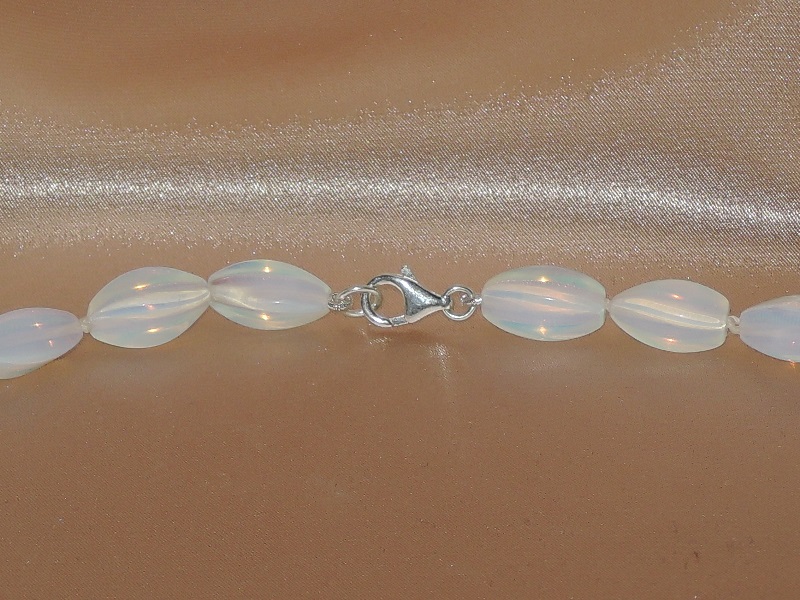 Náhrdelník zo syntetického Aduláru (Mesačný kameň) pozostávajúci z kameňov veľkosti 8x16 mm. Náhrdelník je ukončený strieborným uzáverom rýdzosti 925/1000,dlhý je cca 457 mm. Šperky posielame v darčekovom balení.