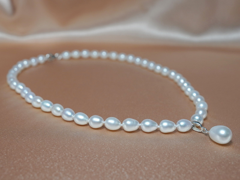 Nádherný náhrdelník OSN077wM pozostávajúci z bielych sladkovodných perál veľkosti cca 7x9 mm a jednej cca 11x9 mm bielej perly tvaru slzy. Väčšia perla je uložená v strede na striebornom prívesku. Medzi každou perlou sú naviazané uzlíky kvôli krajšiemu vzhľadu a bezpečnosti. Dĺžka náhrdelníka je 45 cm a ukončený je uzáverom zo striebra rýdzosti 925/1000. Náhrdelník je možné vyrobiť s inou dĺžkou. Šperk je vhodný na bežné nosenie aj vzácne príležitosti. Náhrdelník posielame v darčekovom balení s certifikátom pravosti a v rámci Slovenska je doprava zdarma.