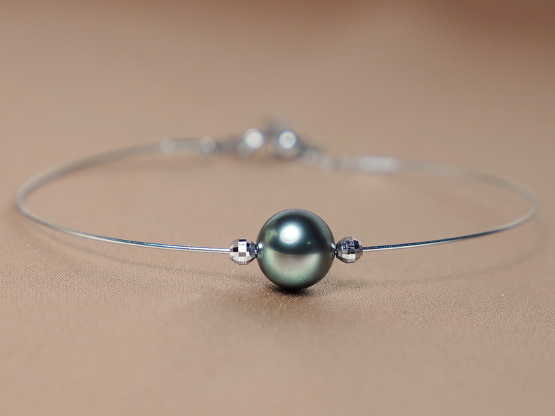 Perlový náramok WW07WB-T vyrobený z bieleho zlata rýdzosti 750/1000 (18 kt.) a pravej tahitskej perly. Perla najvyššej kvality AAA má okrúhly tvar, hladký povrch a veľmi vysoký lesk. Veľkosť perly môžete zvoliť od 8 do 9 mm. Na fotografii je tahitská perla veľkosti 9 mm. Po dohode je možné osadiť viac perál aj iných veľkostí s primeranou zmenou ceny.