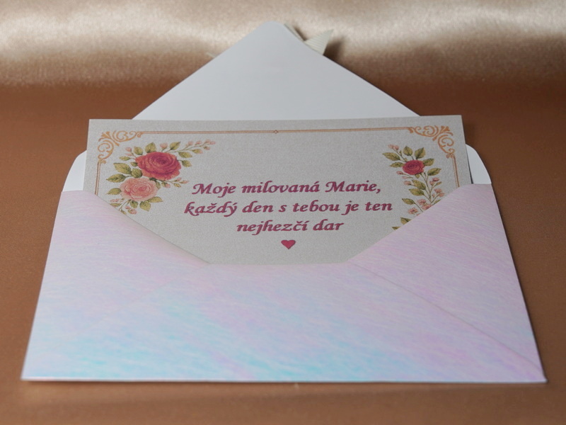 Kartička s osobným venovaním je vložená do perleťovej darčekovej obálky s mašliškou. Súčasťou darčeku je aj luxusné balenie vybraného šperku.