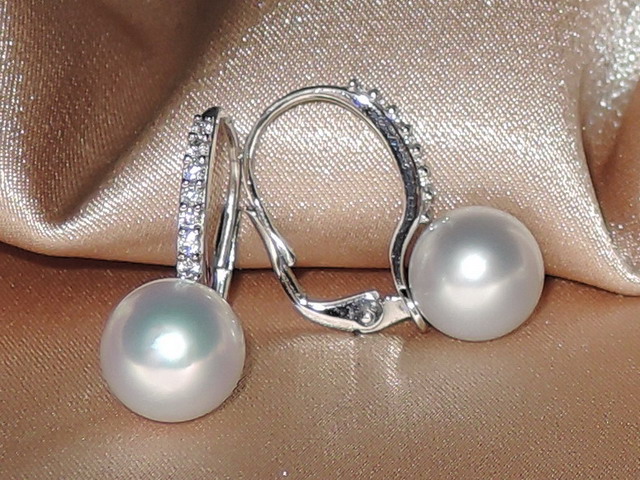 Perlové náušnice vyrobené z pravých bielych juhomorských perál a kovaní z bieleho zlata rýdzosti 585/1000 (14kt.). Perly najvyššej kvality AAA majú okrúhly tvar, hladký povrch a veľmi vysoký lesk. Kovania náušníc pozostávajú z patentov kombinovaných so zirkonmi alebo briliantmi. Brilianty sú v kvalite VVS/G,H. Každá náušnica má 7 ks kameňov veľkosti cca 1,5mm/0,014ct. Hmotnosť páru zlatých kovaní je cca 2,15 gramu. Veľkosť perál môžete zvoliť od 9 do 12 mm. Na fotografii sú perly veľkosti 9,5 mm.Výška patentu je cca 18 mm - vhodnejší pre vyššie prepichnuté dierky. Na požiadanie k náušniciam doporučíme prívesok a prsteň ako kombináciu do setu šperkov. Šperky posielame v darčekovom balení spolu s certifikátom pravosti a v rámci Česka a Slovenska máte dopravu zdarma.