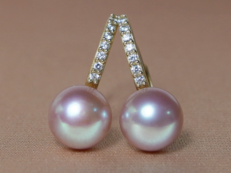 Perlové náušnice vyrobené z pravých fialovoružových sladkovodných perál a kovaní zo žltého zlata rýdzosti 585/1000 (14kt.).