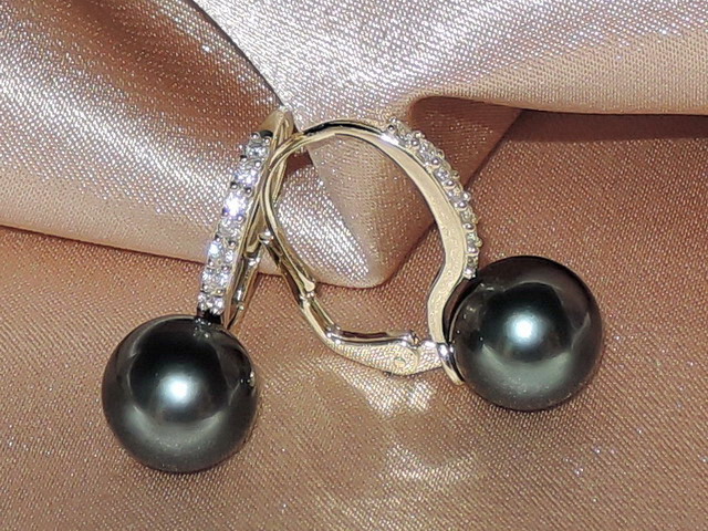 Perlové náušnice tvoria pravé tahitské perly a kovaní zo žltého zlata rýdzosti 585/1000 (14kt.). Perly najvyššej kvality AAA majú okrúhly tvar, hladký povrch a veľmi vysoký lesk. Kovania náušníc pozostávajú z patentov kombinovaných so zirkonmi alebo briliantmi. Brilianty sú v kvalite VVS/G,H. Každá náušnica má 7 ks kameňov veľkosti cca 1,5mm/cca 0,014ct. Hmotnosť páru zlatých kovaní je cca 2,15 gramu, celková hmotnosť náušníc cca 5,2 gramu. Veľkosť perál môžete zvoliť od 8 do 12 mm. Na fotografii sú perly veľkosti 9,5 mm. Výška patentu je cca 18 mm - vhodnejší pre vyššie prepichnuté dierky. Na požiadanie k náušniciam doporučíme prívesok a prsteň ako kombináciu do setu šperkov. Šperky posielame v darčekovom balení spolu s certifikátom pravosti a v rámci Česka a Slovenska máte dopravu zdarma.
