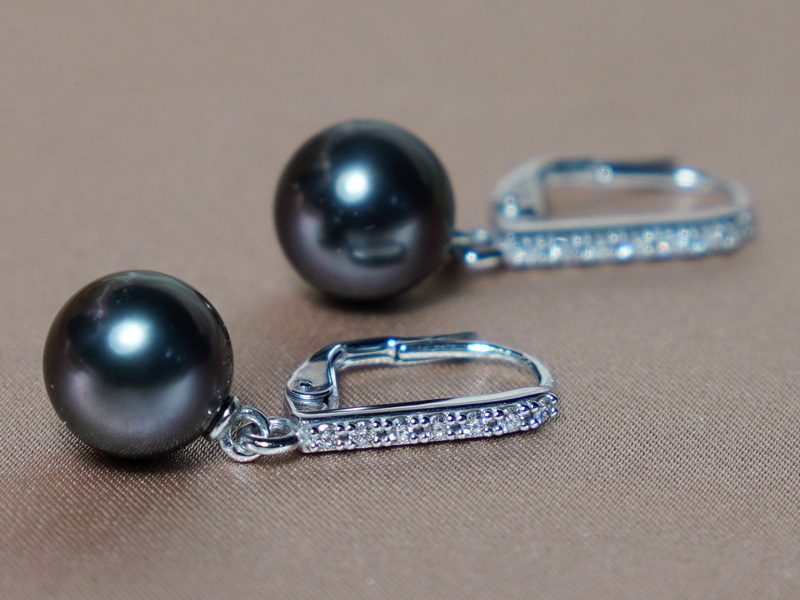 Perlové náušnice BC024WE-T vyrobené z pravých tahitských perál a kovaní z bieleho zlata rýdzosti 585/1000 (14kt.) kombinovaných so zirkónmi alebo briliantmi.