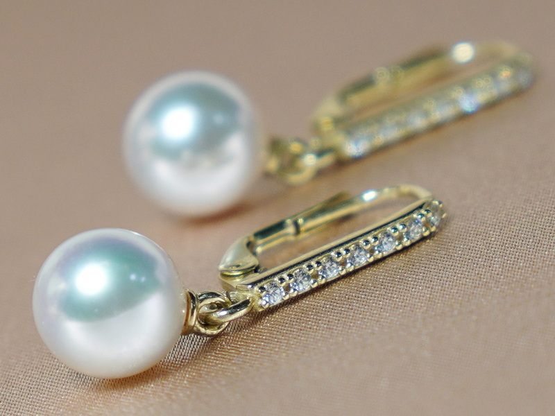 Perlové náušnice BC024YE-W vyrobené z pravých bielych juhomorských perál a kovaní zo žltého zlata rýdzosti 585/1000 (14kt.) v kombinácii so zirkónmi alebo briliantmi.