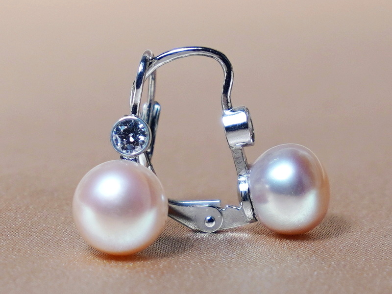 Náušnice vyrobené z broskyňovoružových sladkovodných perál a strieborných kovaní rýdzosti 925/1000 kombinovaných so zirkónmi. Perly majú čiastočne sploštený tvar, hladký povrch a vysoký lesk. Zirkóny náušníc majú veľkosť 3 mm, veľkosť perál môžete zvoliť od 7 do 9 mm. Veľkosť kovaní bez perly je cca 18 x 11 mm. Na fotografii sú náušnice s perlami veľkosti 7 mm. Šperk na bežné nosenie. Šperky posielame v darčekovom balení.