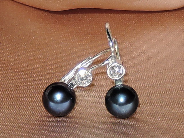 Náušnice vyrobené z čiernych sladkovodných perál a kovaní z bieleho zlata rýdzosti 585/1000 (14kt.) kombinovaných so zirkónmi. Perly s povrchovou kvalitou AAA majú čiastočne sploštený tvar, hladký povrch a vysoký lesk. Zirkóny náušníc majú veľkosť 3 mm, veľkosť perál môžete zvoliť od 7 do 9 mm. Hmotnosť kovaní náušníc je 1,90 gramu. Veľkosť kovaní bez perly je cca 18 x 11 mm. Na fotografii sú náušnice s perlami veľkosti 7 mm. Šperk na bežné nosenie aj vzácne príležitosti. Šperky posielame v darčekovom balení spolu s certifikátom pravosti.
