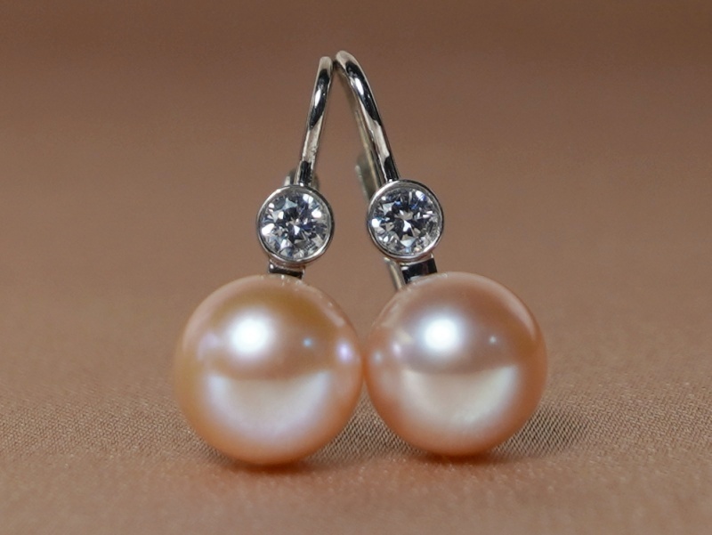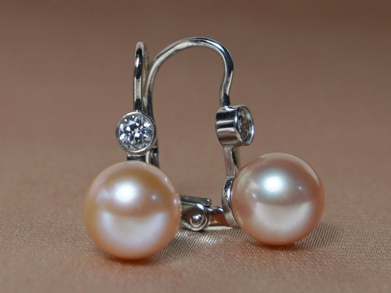 Perlové náušnice vyrobené z pravých broskyňovoružových sladkovodných perál a kovaní z bieleho zlata rýdzosti 585/1000 (14kt.). Perly kvality AAA majú okrúhly tvar, hladký povrch a veľmi vysoký lesk.