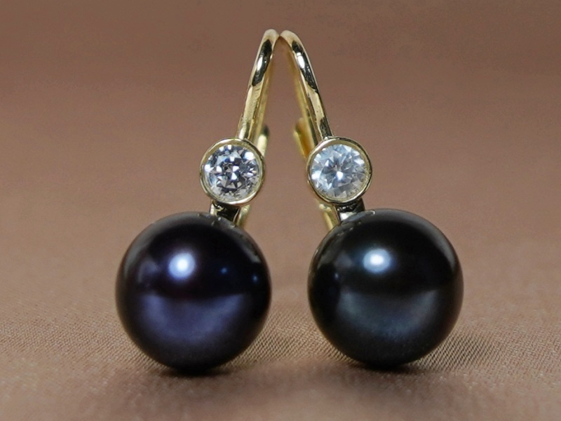 Perlové náušnice vyrobené z pravých čiernych sladkovodných perál a kovaní zo žltého zlata rýdzosti 585/1000 (14kt.).