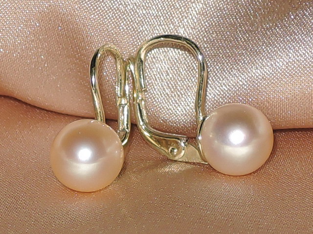 Perlové náušnice vyrobené z pravých broskyňovoružových sladkovodných perál a kovaní zo žltého zlata rýdzosti 585/1000(14kt.). Čiastočne sploštené perly s povrchovou kvalitou AAA majú hladký povrch a veľmi vysoký lesk. Kovania náušníc majú hmotnosť 1,30 gramu. Na fotografii sú perly veľkosti 8 mm. Na požiadanie k náušniciam doporučíme prívesok a prsteň ako kombináciu do setu šperkov. Šperky posielame v darčekovom balení spolu s certifikátom pravosti.