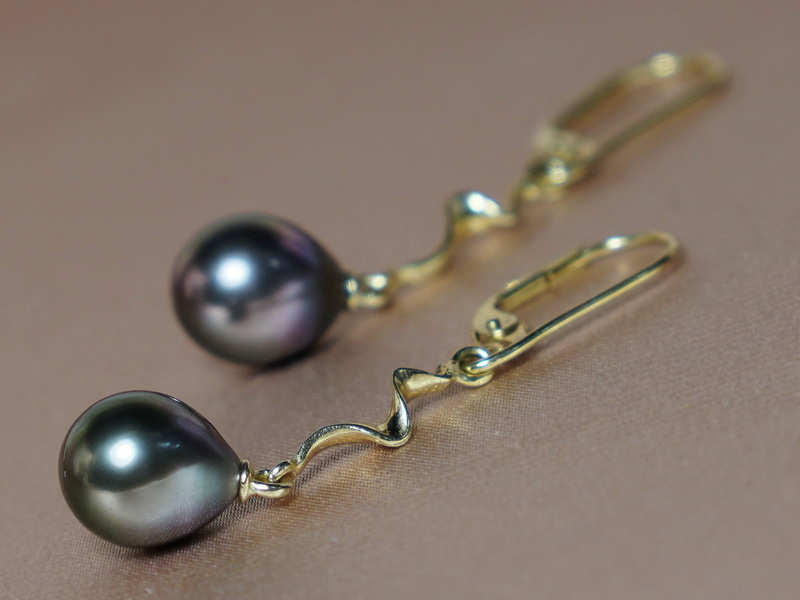 Perly kvality AA+ TPDL200T majú vysoký lesk AAA, povrch s možnosťou drobných chybičiek AA+. Je možné si vybrať perly veľkosti od cca 9 x 10 mm do 10 x 12 mm. Na fotografii sú náušnice z perál veľkosti 9,5 x 10,5 mm. Kovania zo žltého zlata tvaru vlnovky rýdzosti 585/1000 (14kt.) majú hmotnosť 2,30 gramu. Celková dĺžka perlových náušníc je približne 45 mm. Zlaté náušnice s tahitskými perlami sú vhodné k prívesku TDyP300ZM, s ktorým tvoria nádherný set.
