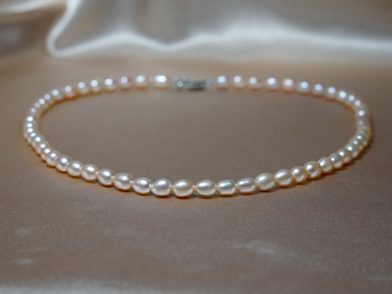Jednoradový náhrdelník vyrobený z broskyňovoružových podlhovastých sladkovodných perál veľkosti cca 6 x 7 mm. Náhrdelník nie je uzlíkovaný a má dĺžku 44 cm. Náhrdelník je ukončený uzáverom z bižutérneho kovu. Náhrdelník je vhodný na bežné každodenné nosenie aj v kombinácii s náušnicami PE0144E. Šperky posielame v darčekovom balení.