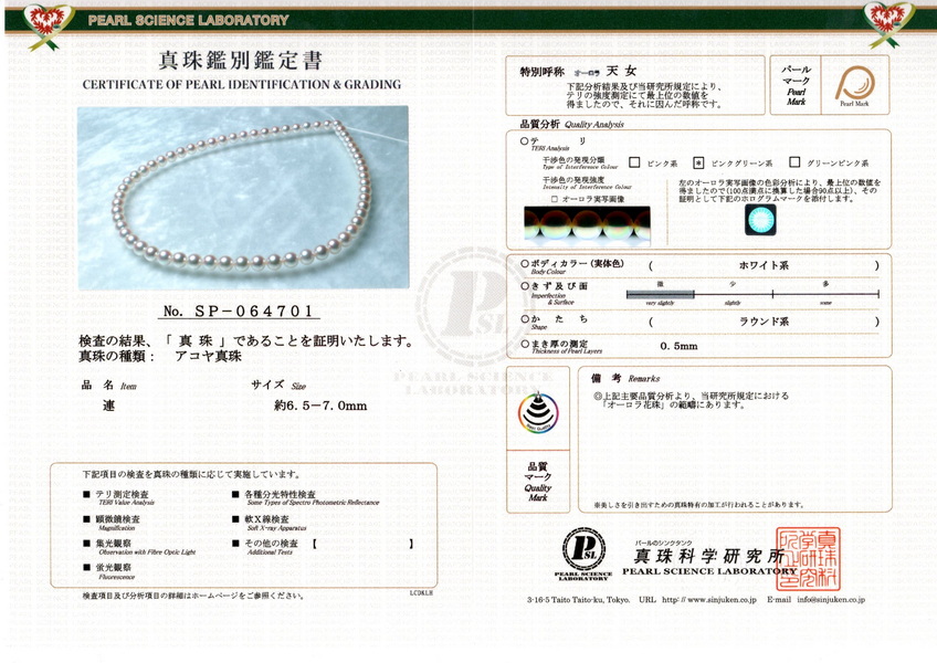Perly sú dodávané s očíslovaným certifikátom typu SP vydaným inštitúciou Pearl Science Laboratory (najvyššie uznávaná medzinárodná inštitúcia na analýzu a hodnotenie perál). Každá perla prešla testovacím procesom, aby sa zabezpečilo, že spĺňa prísne normy potrebné na získanie stupňa Aurora TEN-NYO, vyššieho ako Aurora HANADAMA. Je to najvyšší možný stupeň hodnotenia kvality – vyšší neexistuje. Perly, ktoré dosiahli hodnotenie Aurora TEN-NYO sú starostlivo vyberané a podliehajú tým najprísnejším kritériám. Viac o kvalite Aurora TEN-NYO sa dozviete tu. Náhrdelník viažeme na pevnú hodvábnu niť s uzlíkmi medzi každou perlou kvôli krajšiemu vzhľadu a bezpečnosti na dĺžku 45 cm vrátane uzáveru. Ak máte nejaké otázky, prípadne potrebujete náhrdelník naviazať na inú dĺžku, neváhajte nás vopred kontaktovať.