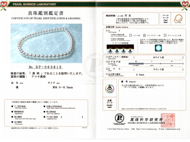 Perlový náhrdelník TEN-NYO 8085 vyrobený z perál veľkosti 8-8,5 mm a uzáveru zo zlata. Najvyšší luxus spomedzi náhrdelníkov japonských akoya perál. Perly sú dodávané s očíslovaným certifikátom typu SP vydaným inštitúciou Pearl Science Laboratory (najvyššie uznávaná medzinárodná inštitúcia na analýzu a hodnotenie perál). Každá perla prešla testovacím procesom, aby sa zabezpečilo, že spĺňa prísne normy potrebné na získanie stupňa Aurora TEN-NYO, vyššieho ako Aurora HANADAMA. Je to najvyšší možný stupeň hodnotenia kvality – vyšší neexistuje. Perly, ktoré dosiahli hodnotenie Aurora TEN-NYO sú starostlivo vyberané a podliehajú tým najprísnejším kritériám. Viac o kvalite Aurora TEN-NYO sa dozviete tu. Náhrdelník viažeme na pevnú hodvábnu niť s uzlíkmi medzi každou perlou kvôli krajšiemu vzhľadu a bezpečnosti na dĺžku 45 cm vrátane uzáveru. K náhrdelníku s certifikátom PSL pridáme aj náš certifikát pravosti, darčekovú kazetu a v rámci Česka a Slovenska vám ho doručíme zdarma. Ak máte nejaké otázky, prípadne potrebujete náhrdelník naviazať na inú dĺžku, neváhajte nás vopred kontaktovať.