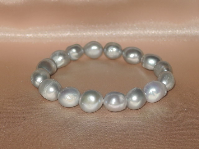 Naťahovací náramok vyrobený zo sivých sladkovodných podlhovastých perál nepravidelného tvaru veľkosti cca 9-10 x 9-11 mm. Na povrchu perál sa vyskytujú nedokonalosti. Perly sú navlečené na silikónovej elastickej gumičke. Dĺžka náramku je 18 cm. Šperky posielame v darčekovom balení.