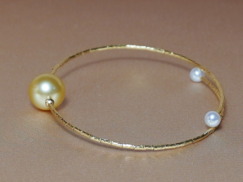 Perlový náramok GB18KAAAZY je elegantný šperk vyrobený zo zlatožltej perly Južného Pacifiku, dvoch bielych sladkovodných perál, pamäťového drôtu a žltého 18 kt. zlata. Základ tvorí pružný pamäťový drôt, na ktorom sú navlečené zlaté rúrkové komponenty rýdzosti 750/1000 s hmotnosťou 0,35 g, sladkovodné perly s priemerom približne 4 mm na koncoch a perla Južného Pacifiku veľkosti 9 - 10 mm v strede náramku.
