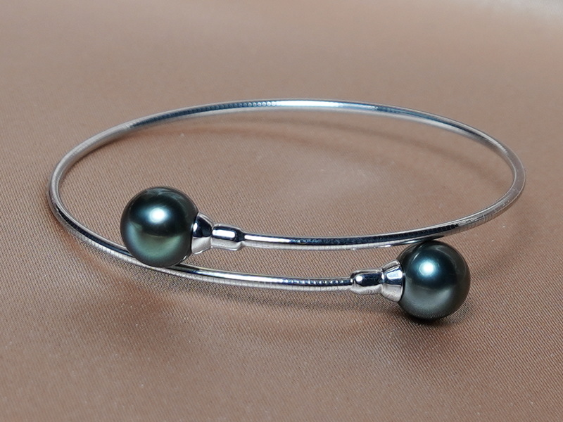 Elegantný perlový náramok TPB100w-B vyrobený z bieleho zlata rýdzosti 750/1000 a dvoch pravých tahitských perál. Konštrukcia náramku je pružná a prispôsobí sa každému bežnému obvodu zápästia, čo je možné vďaka titánovému vláknu vo vnútri konštrukcie. Hrúbka konštrukcie náramku je 1,8 mm, dĺžka 22 cm s prekrytím koncov (18 cm obvod), ktorá sa podľa potreby môže roztiahnuť (zmenšuje sa prekrytie koncov). Celková hmotnosť náramku bez perál je cca 5,50 gramu, z toho 1 gram titánové vlákno. Perly najvyššej kvality AAA majú okrúhly tvar, hladký povrch a vysoký lesk. Veľkosť perál môžete zvoliť od 9 do 11 mm, prípadne po dohode môžete skombinovať veľkosť perál. Po dohode je takisto možné osadiť perly v inej kvalite s primeraným znížením ceny. Náramok posielame v darčekovom balení spolu s certifikátom pravosti a v rámci Česka a Slovenska máte dopravu zdarma.