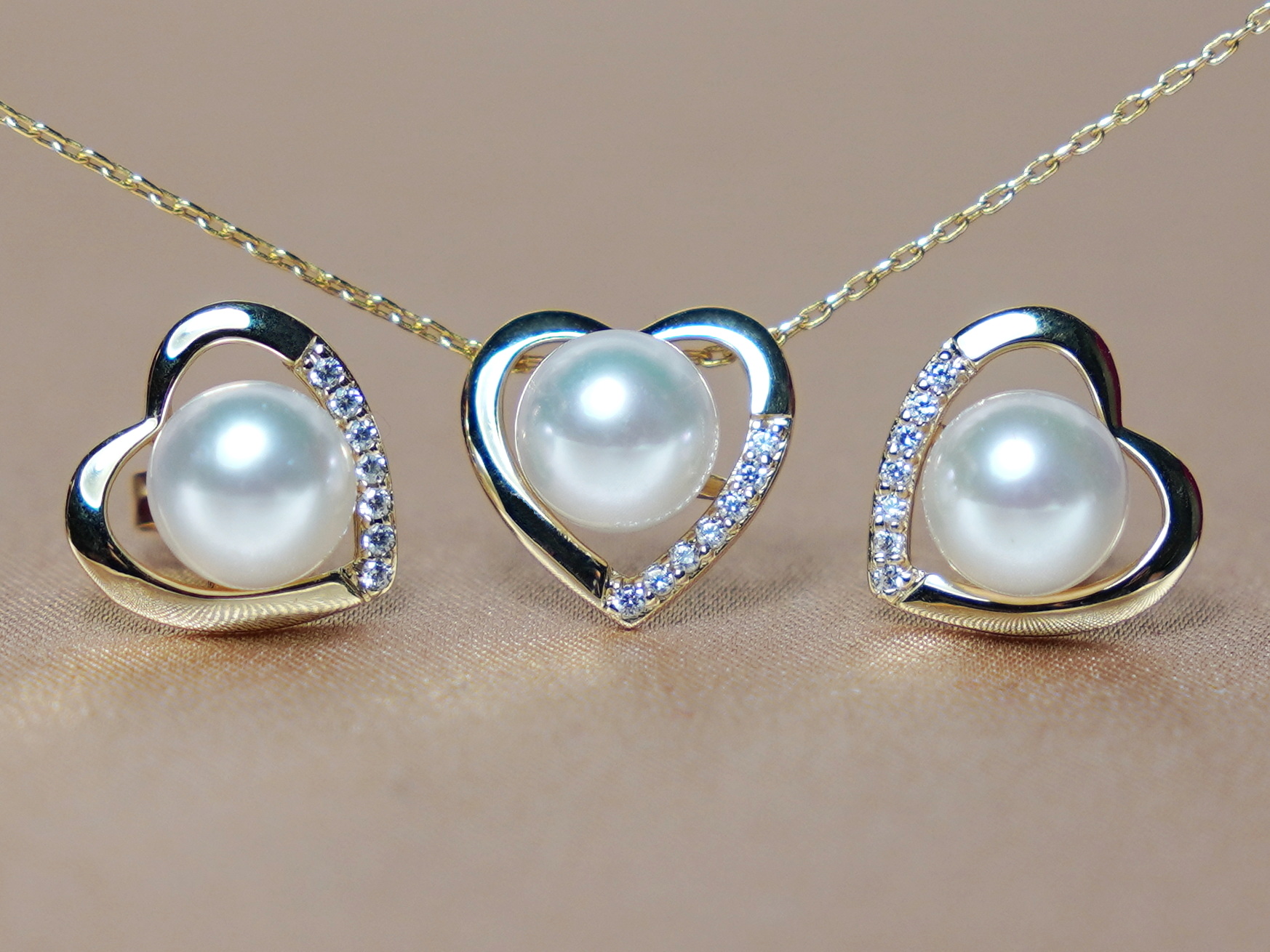 Set šperkov z morských perál WW013YS-A pozostáva zo zlatých náušníc s perlou WW013YE-A a zlatého prívesku s perlou WW011YP-A v tvare srdiečok. Set perlových šperkov je vyrobený z pravých japonských akoya perál v najvyššej AAA kvalite a kovaní zo žltého 14 kt. zlata.