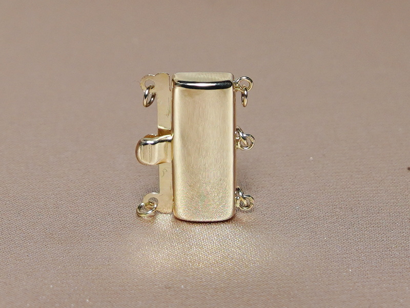 Šperkový uzáver TU100wK na výrobu trojradového náhrdelníka. Uzáver je vyrobený zo 14 karátového žltého zlata - rýdzosť 585/1000. Veľkosť uzáveru je cca 15 x 20 mm. Hmotnosť je cca 2,80 gramu. Uzáver je možné použiť aj k náramkom a náhrdelníkom v našom e-shope (vymeniť za jednoduché uzávery zo striebra, alebo zlata so zodpovedajúcim doplatkom), prípadne použiť na váš náhrdelník, ktorý chcete nanovo preuzlíkovať. Uzáver bezpečne zacvakne pri uzavretí a nie je možné ho otvoriť bez stlačenia jazýčka.