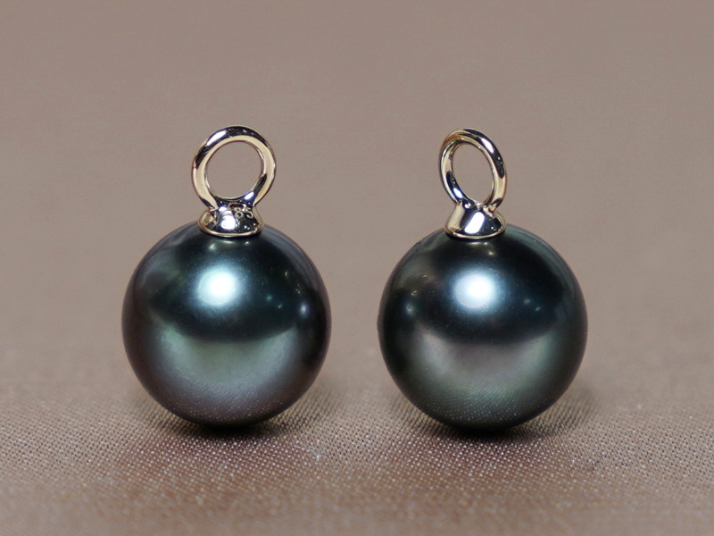 Tahitské perly kvality AAA majú okrúhly tvar, hladký povrch a veľmi vysoký lesk. Do perál sú osadené očká zo žltého zlata rýdzosti 585/1000 (14 kt.) s vnútorným priemerom 2,5 mm s hmotnosťou 0,25 gramu. Tento rozmer umožňuje bezpečné nosenie aj na masívnejších a hrubších zlatých krúžkoch. Na fotografiách sú perly s veľkosťou 9 mm.