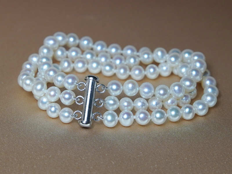 Náramok TB6065AA+wT je vyrobený z troch radov bielych sladkovodných perál veľkosti 6 - 6,5 mm a strieborného uzáveru.