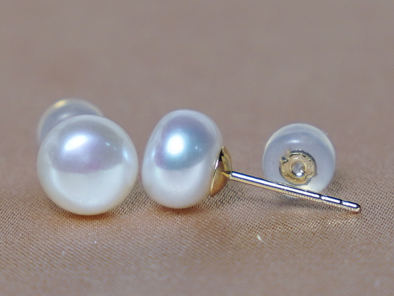 Sladkovodné perly s povrchovou kvalitou AAA majú sploštený tvar (button), hladký povrch a vysoký lesk. Na povrchu sa môžu vyskytovať drobné nedokonalosti v rámci uvedenej kvality. Napichovacie klince náušníc sú vyrobené zo zlata rýdzosti 585/1000 s hmotnosťou 0,20 g. Vo vnútri silikónových zatláčacích koncoviek sú malé puzetky takisto z 14 kt. zlata, kvôli vyššej bezpečnosti. Veľkosť perál môžete zvoliť od 5 do 10 mm. Na fotografiách sú perly veľkosti 7 mm. Ak neviete, akú veľkosť perál na náušnice vybrať, pozrite sa na ilustračný obrázok.