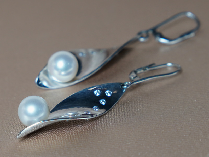 Perly najvyššej kvality AAA majú okrúhly tvar, hladký povrch a vysoký lesk. Kovania náušníc sú vyrobené z ródiovaného bieleho zlata rýdzosti 585/1000 (14kt.) kombinované so zirkónmi veľkosti 2mm. Celková hmotnosť zlata páru náušníc je 11 gramov. Celková dĺžka náušníc s patentom je 68 mm. Tieto náušnice sú jeden z luxusných šperkov vlastného designu "BCstyle". Zlaté náušnice splnia očakávania náročných klientov, ktorí hľadajú najvyššiu kvalitu v spojení s jedinečnosťou šperku, ktorý nemožno vidieť v ponukách iných predajní.